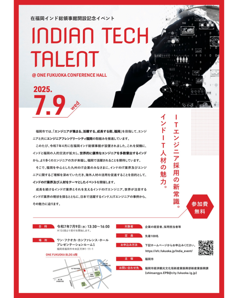 7月9日(水)13:30〜16:00、ONE FUKUOKA BLDG 6Fにて開催される「在福岡インド総領事館開設記念イベント INDIAN TECH TALENT」に、