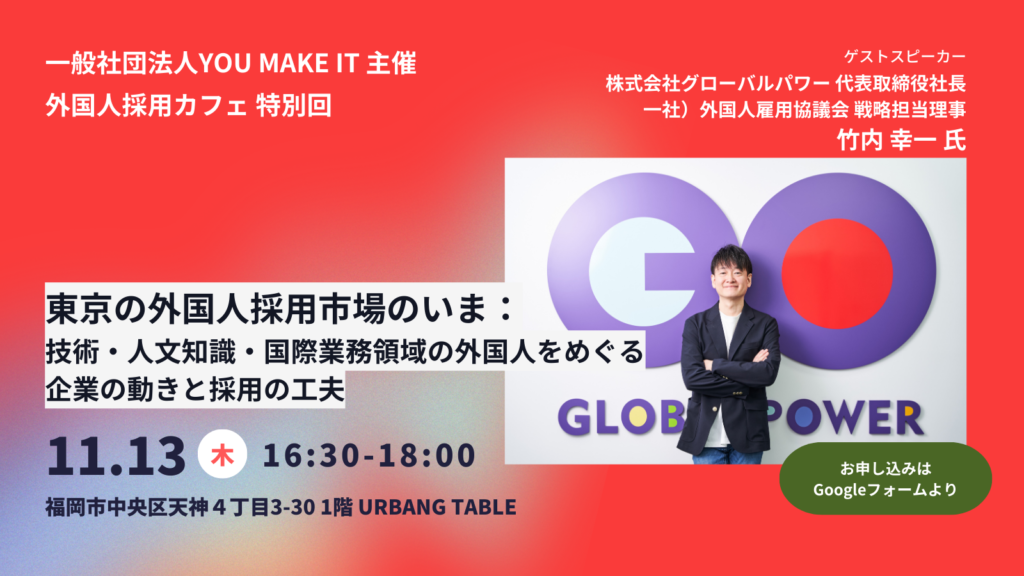 当日は『高度外国人材・求人サイトNINJA』を展開する 株式会社グローバルパワー 代表取締役社長 竹内 幸一氏をゲストにお迎えします。現場で蓄積された知見をもとに、「技術・人文知識・国際業務」領域における最新の東京の採用動向をわかりやすくご紹介いただきます。