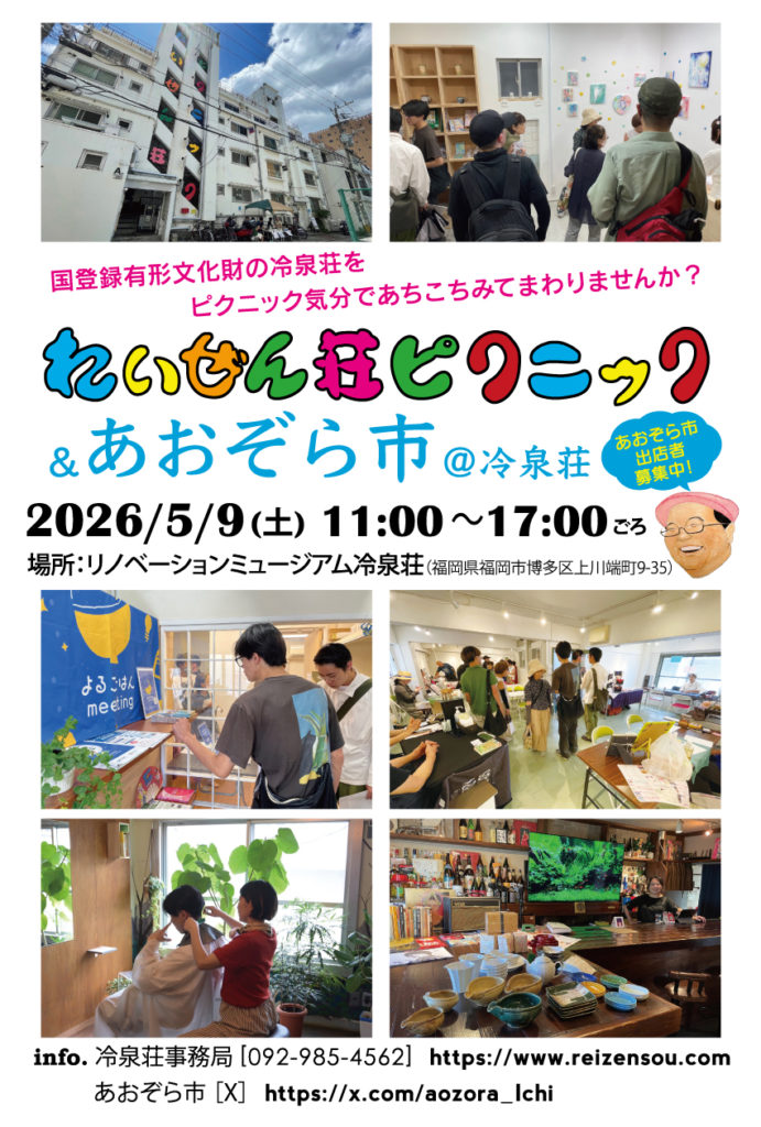 れいぜん荘ピクニックは、築67年を迎えるビンテージビル・冷泉荘をめぐりながら、お部屋見学やイベント参加、あおぞら市、冷泉荘ツアーなどを楽しめる一日です。作家さんやデザイナーさんの作品、雑貨やお菓子などにも出会える、まさに“散策するように楽しむ”イベントです。冷泉荘に遊びに来られる皆さまに、YOU MAKE ITのことも知っていただけたら嬉しいです。